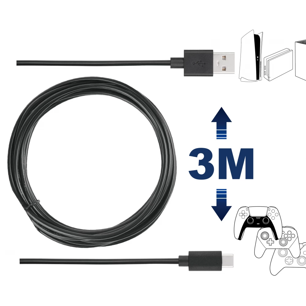 3 méteres USB C kábel a PS5 Dual Sense vezérlők lejátszásához és töltéséhez. Lehetővé teszi, hogy kényelmes távolságban játsszon a TV-től a kontroller töltése közben. DualSense PS5, Nintendo Switch Pro Controller és Xbox X Series Controller kompatibilis.