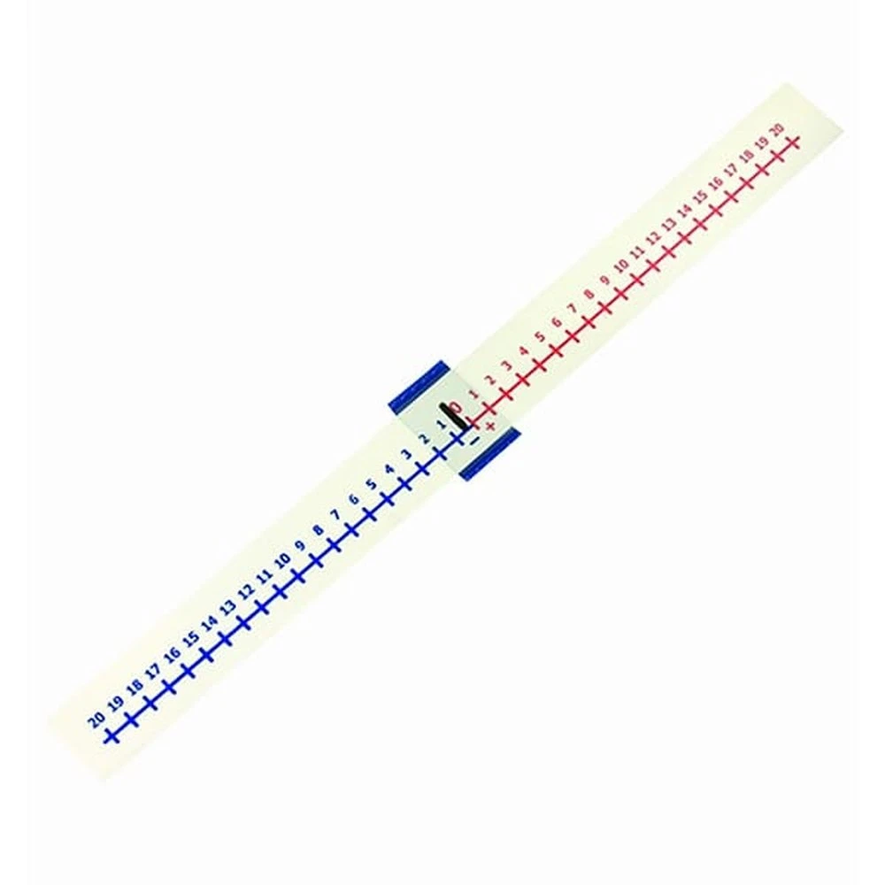 Műanyag számegyenes iskolai és oktatási célokra. A skála mínusz 20-tól plusz 20-ig terjed, így alkalmas alapvető matematikai műveletek szemléltetésére, összeadás és kivonás tanításához.