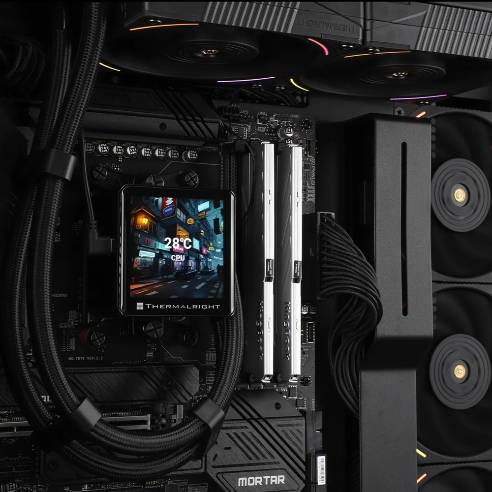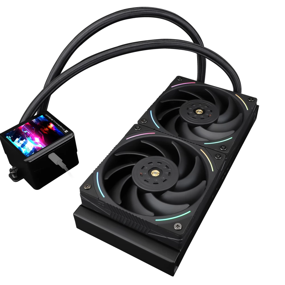 Kompakt, univerzális, vízhűtés 2 darab 120mm-es PWM sebesség szabályzású és vezérelhető ARGB világítású (a ventilátor keret sarkai) ventilátorral és szintén vezérelhető ARGB világítású CPU vízhűtő blokkal amin egy szögletes 2.88" IPS kijelző is található (képek, animációk, rendszer információk megjelenítése).