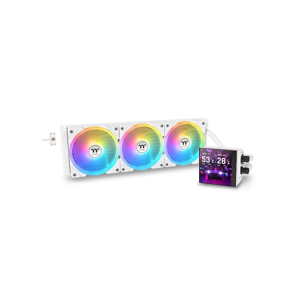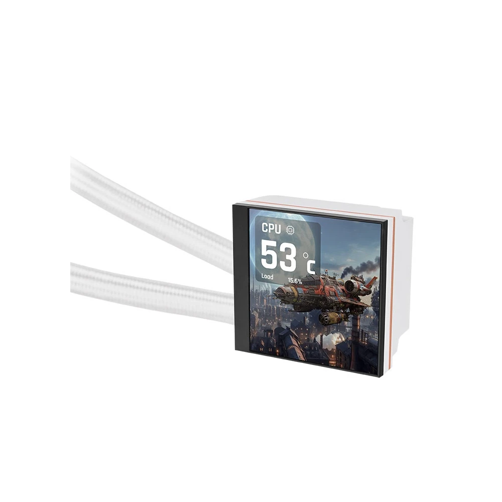 Kompakt, univerzális vízhűtés 3 darab 120mm-es vezérelhető ARGB világítású (gyűrű és lapátok) és PWM sebesség szabályzású ventilátorral, 360mm-es radiátorral és egy szögletes CPU vízhűtés blokkal. A hűtés különlegessége a CPU hűtőblokk fedelén található 3.95"-os, 480x480 felbontású kijelző amin különböző képeket, animációkat, hőmérséklet információkat stb. jeleníthetünk meg, a keskeny (27mm) vastag rézkamrás hűtőborda, a kábelek nélkül összekapcsolható ventilátorok, melyek lapátjai cserélhetőek (fordított állású lapátok mellékelve) és a réz CPU érintkező felület.