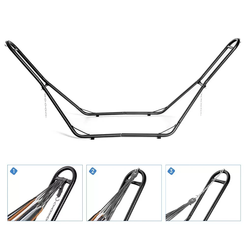 A két S-alakú kampó és az állítható lánc lehetővé teszi, hogy a legtöbb szabványos méretű függőágy biztonságosan rögzíthető legyen. Legyen szó brazil stílusú vagy hagyományos textilfüggőágyról, ez az állvány stabil tartást nyújt mindkettőhöz.