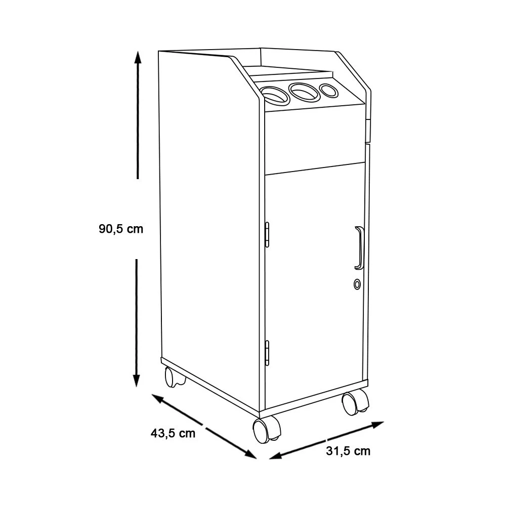 A tágas eszközkocsi több rekeszt és tárolóhelyet kínál kozmetikai szerszámok, kellékek és termékek rendezett elhelyezéséhez. Zárható kialakításának köszönhetően értékei biztonságban vannak, akár mozgás közben is.