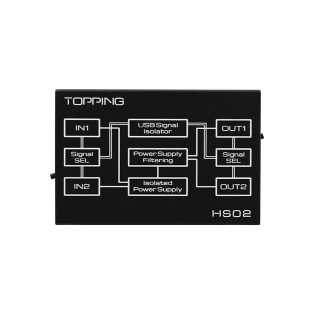 A Topping HS02 egy nagy teljesítményű USB izolátor és zavarszűrő kettős csatlakozással. Teljesen szigetelt, így nem vezet be új interferenciát kiegészítő tápegység használata során, az audiojel tökéletesen el van szigetelve bármilyen földhuroktól. Kettős bemeneti és kimeneti csatlakozási lehetőséggel rendelkezik: USB-B és USB-C a bemeneti oldalon, USB-A és USB-C a kimeneti oldalon. Mindkét oldalon egy-egy kapcsoló található a kívánt bemenet és kimenet kiválasztásához. A HS02 támogatja a magas mintavételi sebességeket is, akár PCM 32bit 768kHz-ig és DSD512-ig.