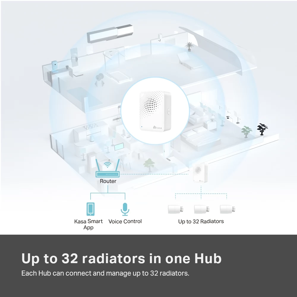 A Kasa intelligens hőtermosztát-kezelő rendelkezik egy központi vezérlővel, amely a Kasa appon keresztül vezérelhető, valamint egy radiátorszeleppel, amely pontosan szabályozza a radiátor hőfokát.