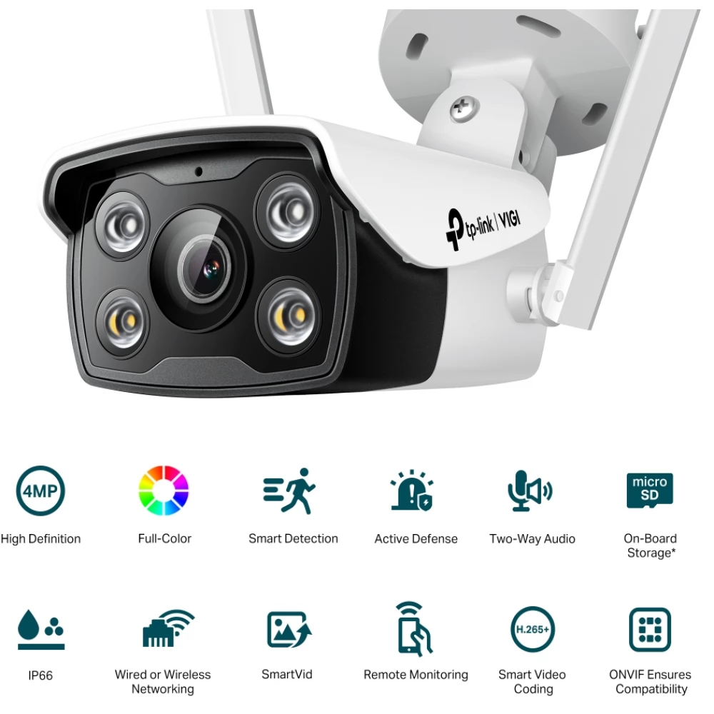 A TP-LINK VIGI C340-W kültéri, színes biztonsági kamera az Ön megbízható társa lesz otthona vagy üzleti helysége biztonságának fenntartásában. Könnyen felszerelhető és telepíthető, a VIGI alkalmazással pedig könnyen kezelhető akár távolról is. Csatlakoztatása vezetékkel és Wi-Fi kapcsolaton keresztül is megoldható. Megbízható IP66 védelemmel rendelkezik a stabil kültéri teljesítményért.