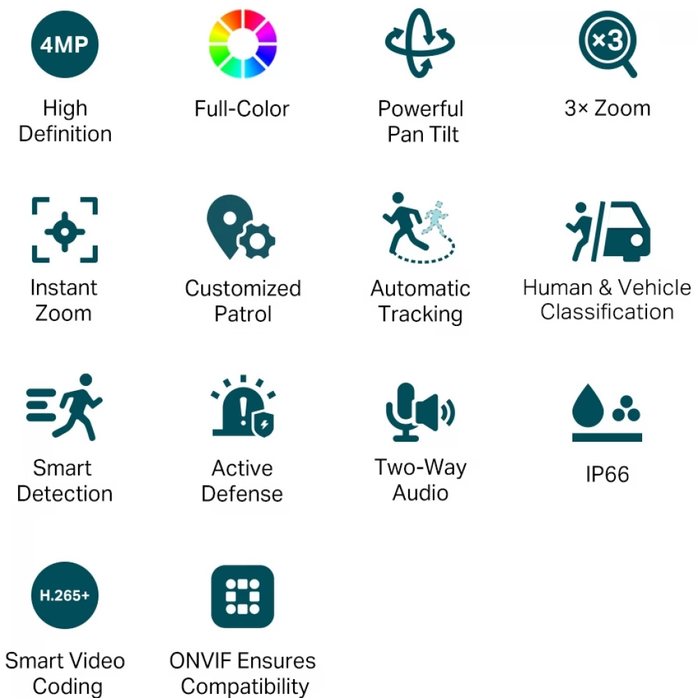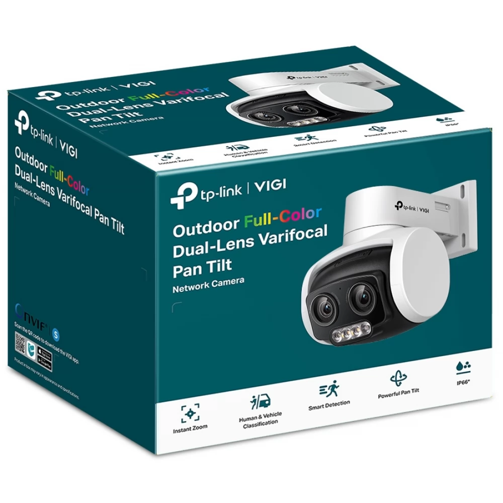 A TP-LINK VIGI C540V egy 4MP-es kültéri, teljes színű, dupla lencsés, változtatható fókuszú, forgatható-billenthető hálózati kamera, mely a biztonsági technológia legújabb vívmányait kínálja. IP66-os vízálló kivitelének köszönhetően kültéri használatra is alkalmas.