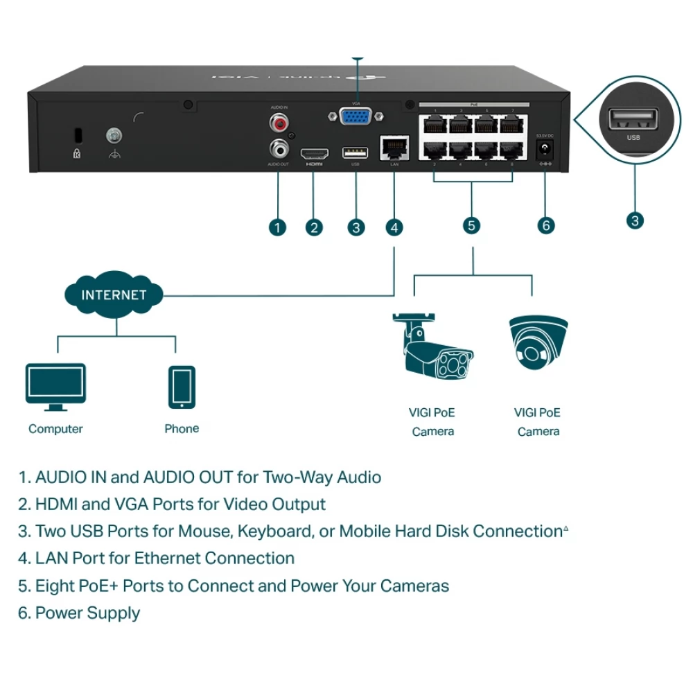 Kulcsfontosságú jellemzője az állandó tápellátás és az adatátvitel biztosítása a csatlakoztatott kamerák számára a PoE+ (Power over Ethernet) technológia segítségével. 8 db 10/100 Mbps PoE+ porttal rendelkezik, és minden PoE+ porton akár 30 W teljesítményt is támogat. Úgy tervezték, hogy egyetlen Ethernet-kábellel biztosítsa az adat- és energiaátvitelt, ezáltal rugalmas telepítést kínál, így a kisvállalkozások, például élelmiszerboltok, raktárak, éttermek és pénzügyi intézmények különféle megfigyelési helyzeteiben is használható. Így megszabadul a felesleges kábelektől, illetve csökkenti a telepítési költségeket is.