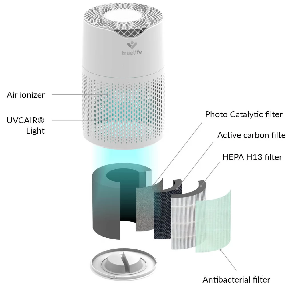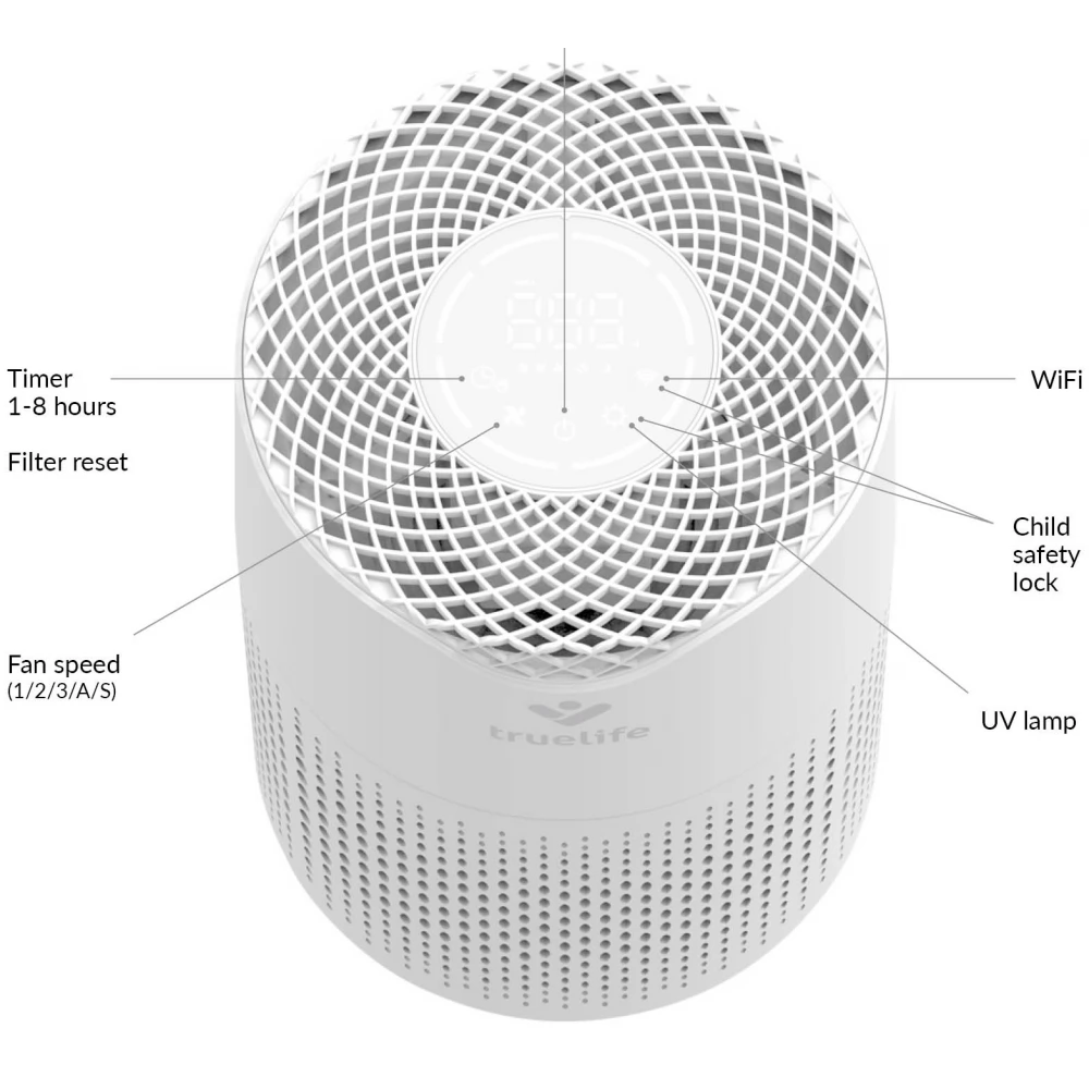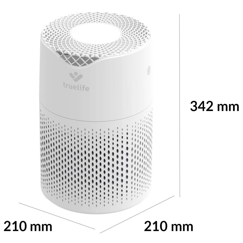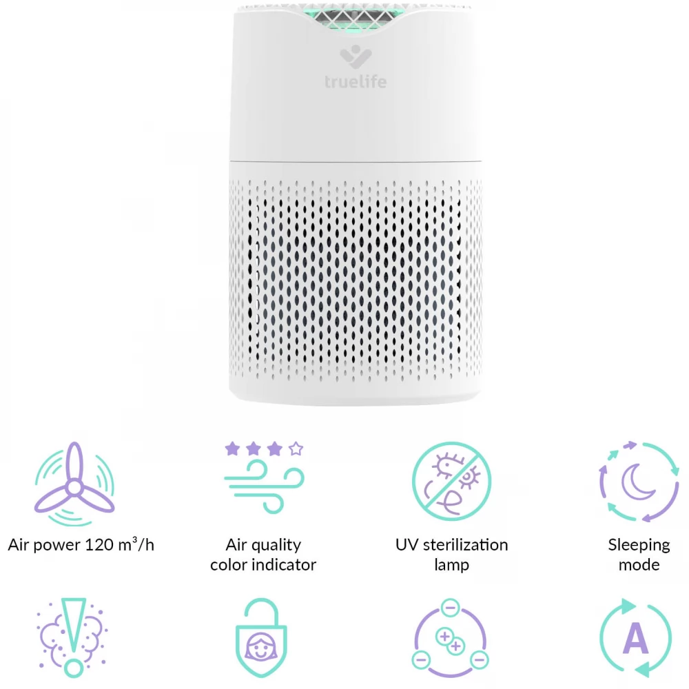 A TrueLife légtisztító óránként 120 m3 levegőt tisztít meg. 12-18 m2 alapterületű helyiségekbe alkalmas, kis súlyának köszönhetően gond nélkül hordozható. A tisztító általában javítja a levegő minőségét, elpusztítja a vírusokat, baktériumokat és egyéb szennyeződéseket, valamint jelentősen segíthet az allergiásokon vagy asztmásokon. A légtisztító színes levegőminőség-kijelzőkkel, automatikus légszennyezés-detektálás, valamint automatikus tisztítás funkcióval rendelkezik. Ha fokozottan poros a környezete, minden bizonnyal örülni fog a porérzékelőnek. Az antibakteriális szűrő, HEPA-szűrő, szénszűrő, katalitikus szűrő, UV-fény és ionizálás képezte hatszoros szűrésnek köszönhetően a készülék befogja a levegőben szálló por akár 99,9%-át, valamint megtisztítja azt az illékony szerves vegyületek akár 93,5% -ától. Vírusokat és koronavírusokat is szűri.