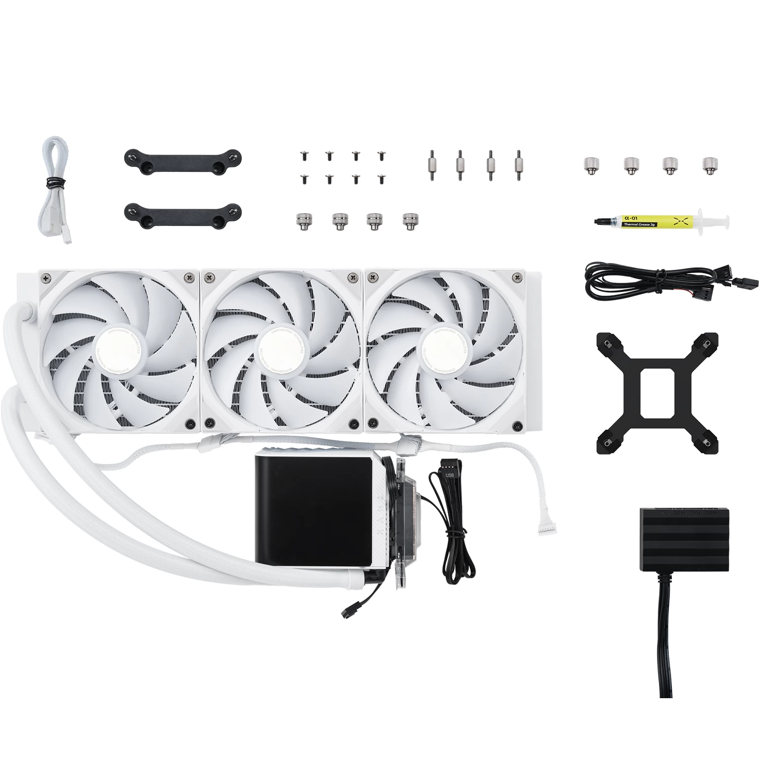 Kompakt, univerzális vízhűtés 3 darab 120mm-es vezérelhető ARGB világítású és PWM sebesség szabályzású ventilátorral, 360mm-es radiátorral és egy L alakú AMOLED kijelzővel felszerelt CPU hűtőblokkal.
