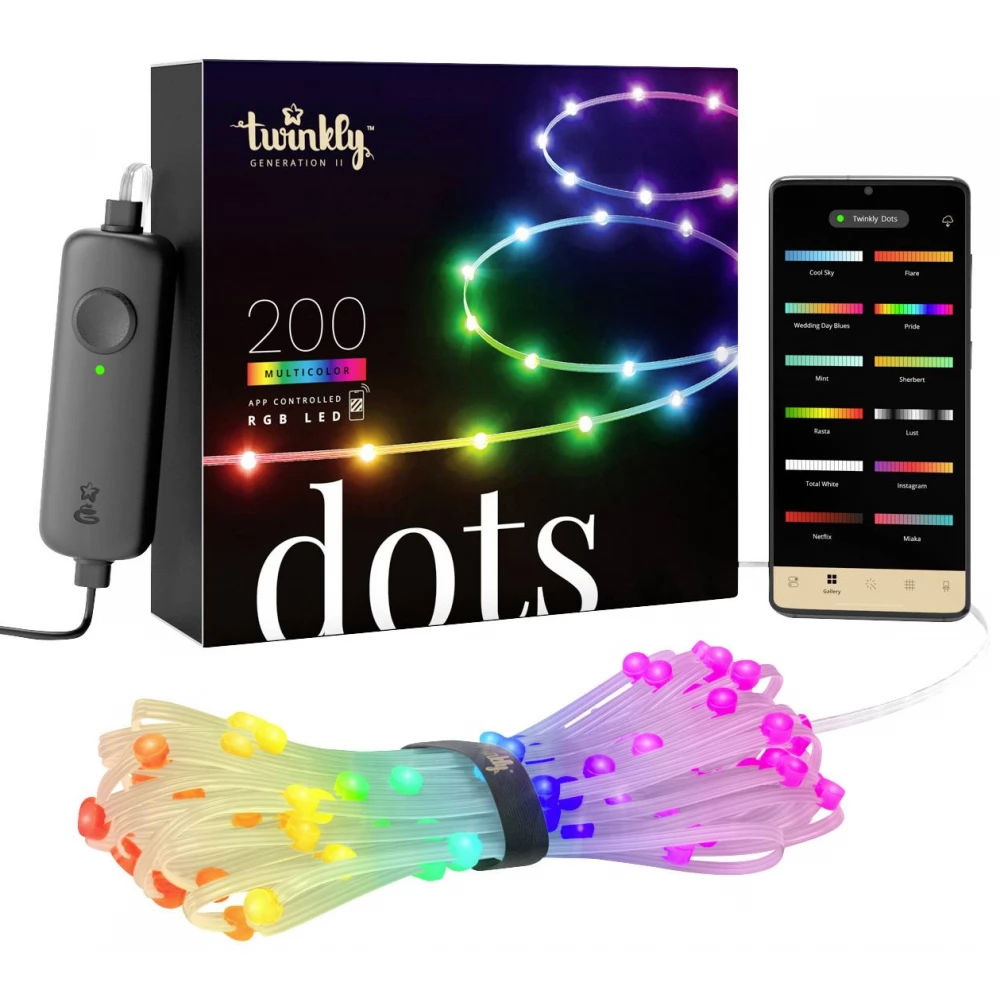 A Twinkly Dots egy miniatürizált és rugalmas LED-füzér, amely alkalmazásokon és hangalapú asszisztenseken keresztül vezérelhető. A 10 méteres megvilágított hosszal 200 speciálisan tervezett 7 mm-es RGB LED-ből áll, amelyek lapos matt fejjel rendelkeznek a lenyűgöző fényerőszintek és a tökéletes színárnyalatok elérése érdekében, a Twinkly Dots ötvözi a klasszikus LED-füzérek sokoldalúságát a dekoratív beltéri világítás prémium megjelenésével, új határokat hozva az otthoni világításba. Alkalmas beltéri és kültéri használatra (IP44). A Twinkly Dots kábelének színe átlátszó.