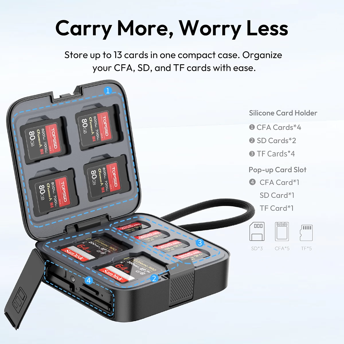 - Beépített tárolás: akár 13 memóriakártya rendszerezett elhelyezésére alkalmas