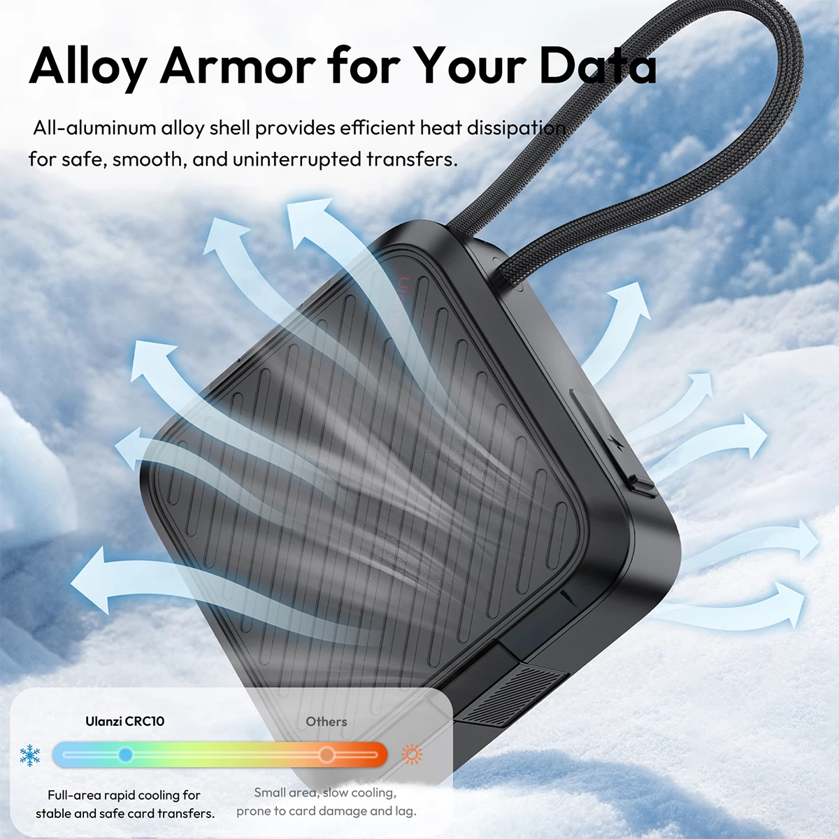 Az Ulanzi CRC10 egy kompakt és sokoldalú megoldás memóriakártyák olvasására és tárolására. Egyesíti egy professzionális kártyaolvasó és egy strapabíró tároló tok előnyeit, így ideális választás fotósoknak, videósoknak és digitális tartalomkészítőknek. Támogatja a CFexpress TypeA, SD és microSD formátumokat, a gyors adatátvitelhez pedig USB-C csatlakozót kínál akár 10Gb/s sebességgel. A belső elrendezés lehetővé teszi több kártya biztonságos és rendszerezett tárolását.