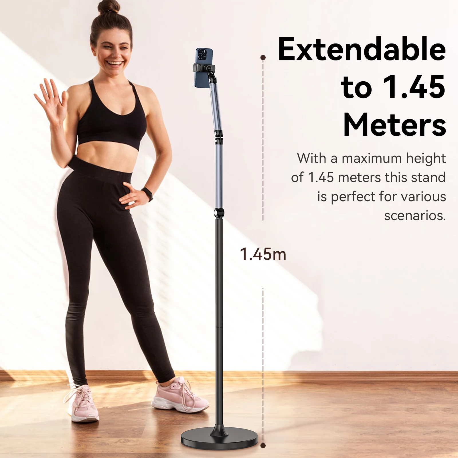 - Teleszkópos kialakítás, amely lehetővé teszi az állvány magasságának 145 cm-ig történő beállítását