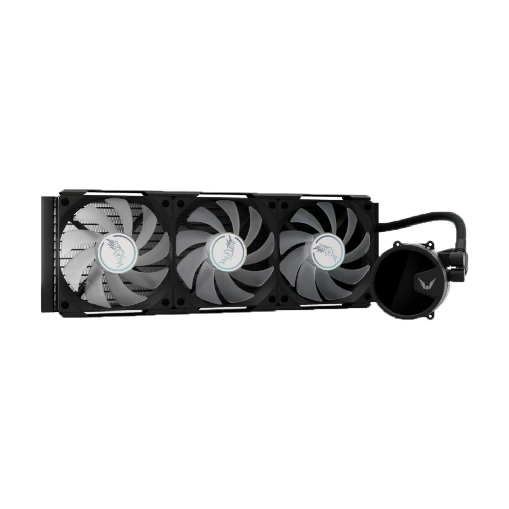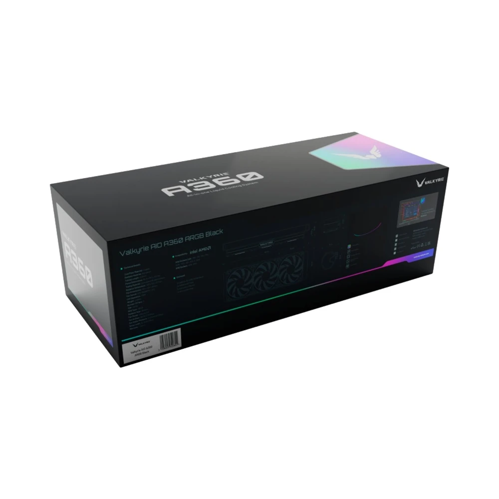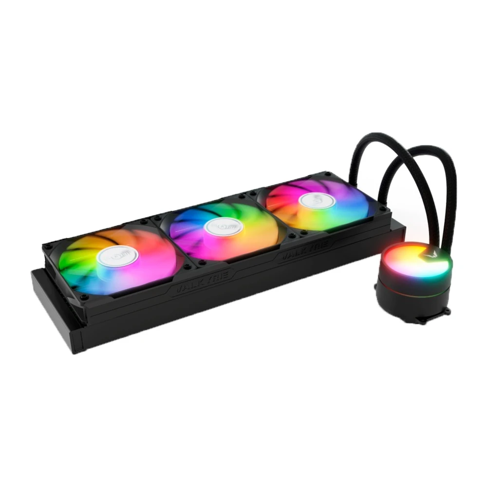 Kompakt univerzális vízhűtés 3 darab 120mm-es vezérelhető ARGB világítású és PWM sebesség szabályzású ventilátorral, 360mm-es radiátorral és szintén vezérelhető ARGB világítású CPU vízhűtés blokkal aminek a fedele forgatható, igazodva a ház orientációjához.
