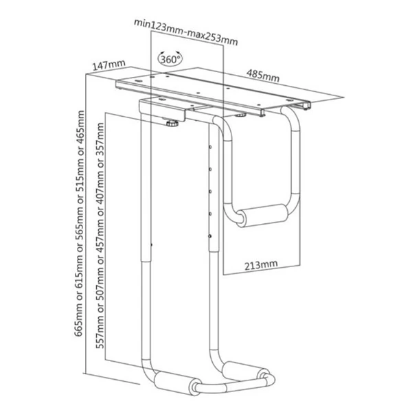 Masszív asztal alatti PC-tartó a több helyért a munkaasztalon - állítható magasságban (123-253 mm) és szélességben (357/457/507/557 mm), 360°-ban forgatható!