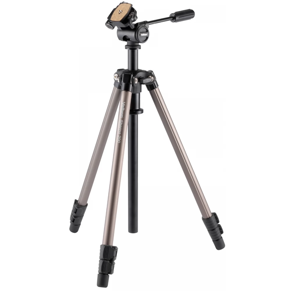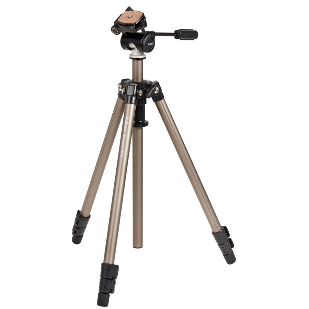 A Velbon Sherpa 200R állvány PH-157Q 3 irányú, forgatható és dönthető fejjel akár 3,5 kg-t is elbír, összecsukva 62,5 cm és egy gyorskioldó lemezt is tartalmaz. A három részből álló lábak mindegyike billenthető reteszeléssel rendelkezik a gyors beállítás érdekében.