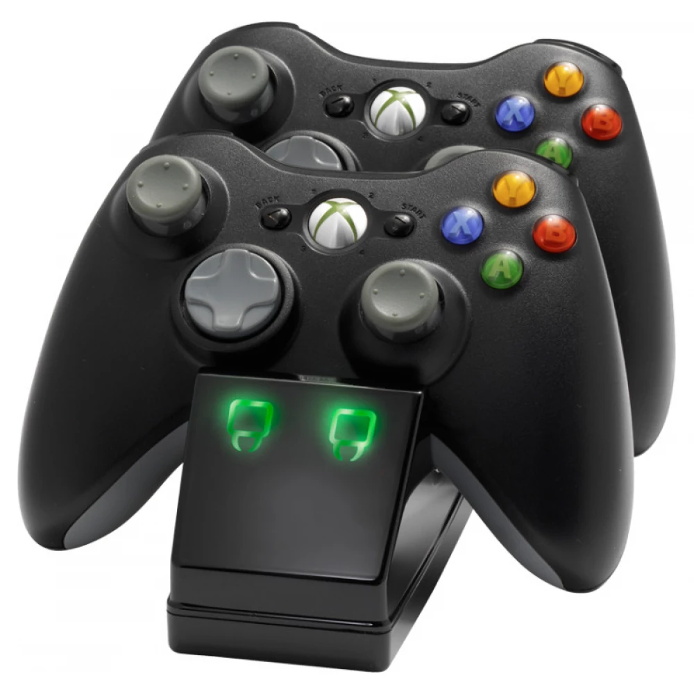 Tárold és töltsd Xbox 360 vezeték nélküli kontrollereidet egyszerűen a Dupla töltő állomás használatával! A csomag két darab tölthető akkumulátort foglal magában, valamint egy töltőállomást, amire egyszerűen csak rá kell helyezned az éppen nem használt Xbox 360 kontrolleredet, és az maximum 4 óra elteltével újra teljes töltéssel áll majd rendelkezésedre. A töltőállomást USB porton keresztül csatlakoztathatod Xbox 360 konzolodhoz.
