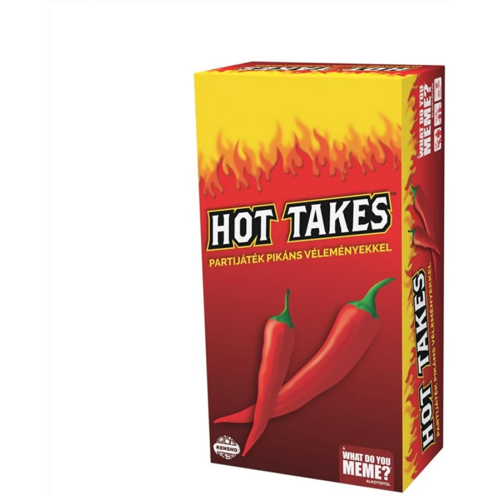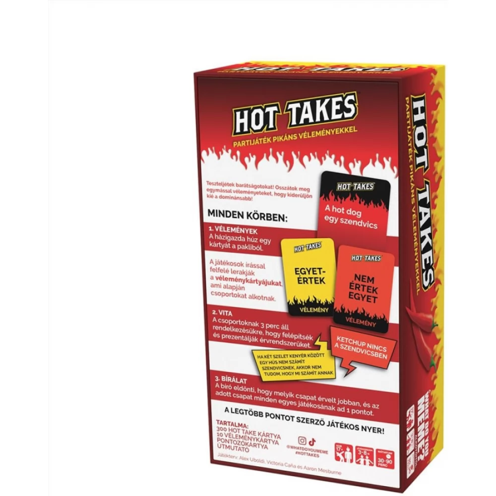 A közös cél, élmény, meglátás páratlan barátságokat épít, de vajon mi mindenben egyezik ténylegesen a véleményetek? Ideje felfedezni, és jobban megismernetek egymást! Megérkezett a Hot Takes, a pikáns vélemények partijátéka a What Do You Meme? alkotóitól. A hot-dog vajon szendvics vagy sem? Van-e értelme a papír szívószálnak, amíg műanyag pohárbal iszunk vele? A jó megjelenés a személyiség rovására megy? Legyen nyilvános egy leánykérés? Kell-e annyi apasági szabadság, mint amennyit egy anya kap? Az egyik félnek mindig dominánsabbnak kell lennie egy kapcsolatban? Mondd el a véleményed, és ismerd meg a többiekét a Hot Takes társasjátékban, ahol 300 kérdéskártyára reagálhatsz egyetértéssel vagy elutasítással. Hot Takes beszélgetésindító partijáték a What Do You Meme? alkotóitól. A játékot 18 éves kortól ajánljuk, 3-8 fős társaságoknak.