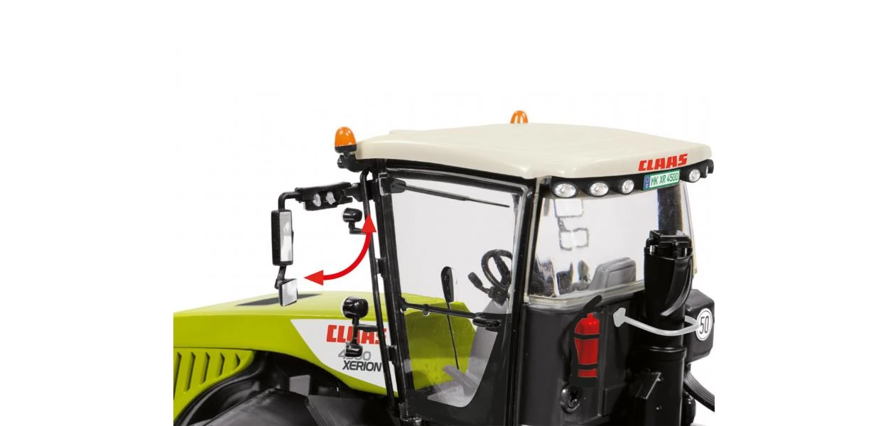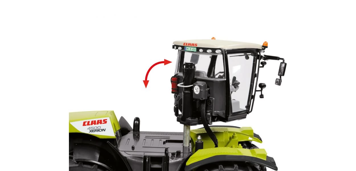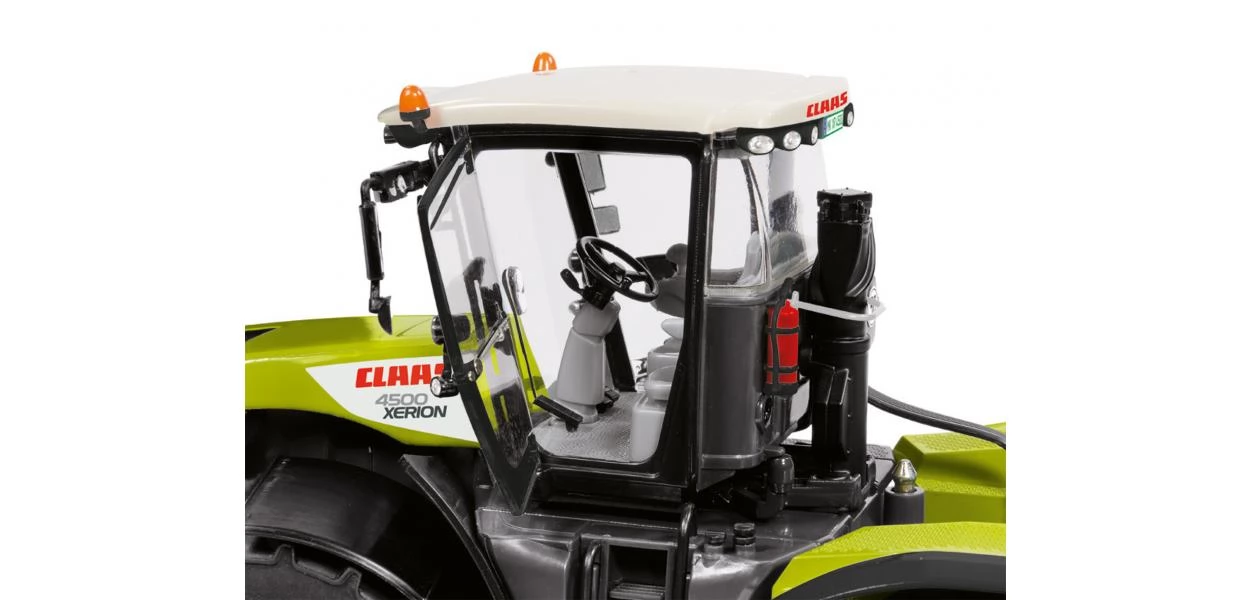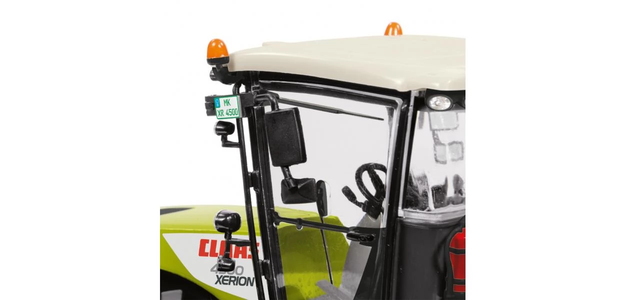 Aprólékosan kidolgozott, 1:32 méretarányú (mérete: 24 x 10 x 13.5 cm) Claas Xerion 4500 fém (műanyag részekkel) traktor modell nyitható ajtókkal, behajtható tükörrel, felemelhető vonóhoroggal, forgatható fülkével illetve ahogy az eredeti változatnak ennek mindkét tengelye kormányozható, elforgatható.