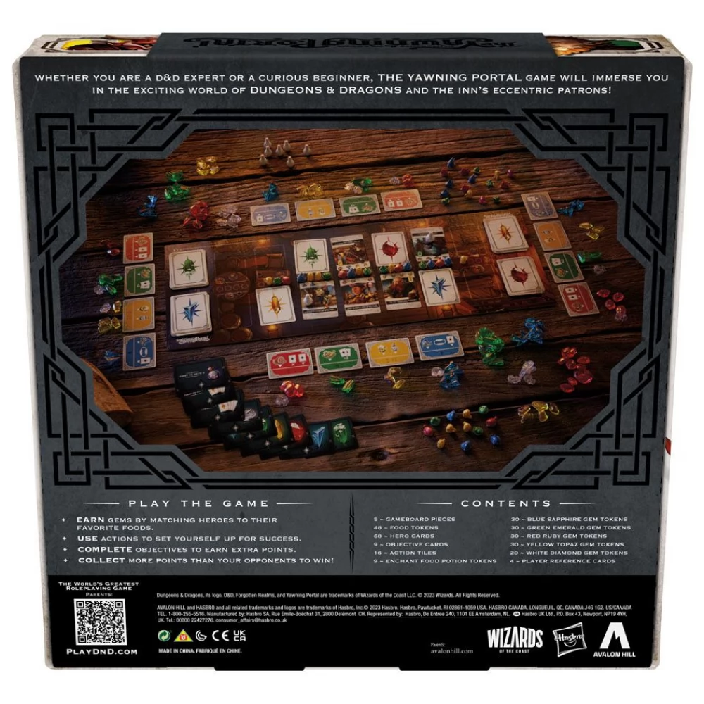 A Dungeons & Dragons: The Yawning Portal-ban a fogadó személyzeteként neked kell gondoskodnod a betérők betevő falatjáról úgy, hogy összepárosítod az ételjelzőket a hős kártyájukon látható rendelésekkel. Színes drágaköveket (és pontokat) kapsz minden egyes megfelelő ételjelzőért, és bónuszt a rendelés teljesítéséért. A táblán leggyakrabban megjelenő színes drágakövek érik a legmagasabb pontot és jattot, így megfelelő stratégiával a számok neked kedvezhetnek majd - és ne félj bájitalokat bevetni, hogy a vendégek igazán megszeressék az ételeidet! Gyűjts minél több pontot, teljesíts kihívásokat vagy szerezz játék végi bónuszokat.