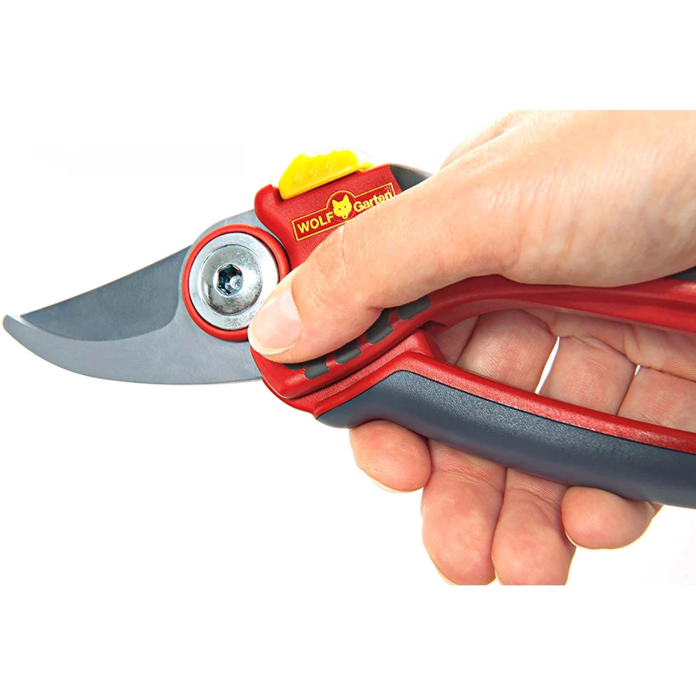 - A Wolf-Garten kettős vágóélű metszőolló vágásátmérője 22 mm, vágási szöge pedig 30 fokos. A penge feszességét Ön állíthatja be, tetszés szerint