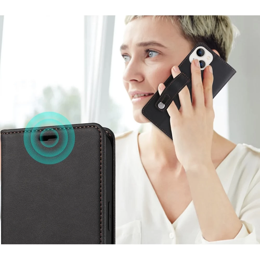 2 darab kártyanyílással, pénztárca rekesszel és mágneses záródással segít a személyi igazolvány, jogosítvány, hitelkártyák papírpénze tárolásában, megőrizve annak biztonságát. A pontos kivágások könnyű hozzáférést biztosítanak az összes gombhoz, kamerához, hangszóróhoz és csatlakozóhoz, így a telefont anélkül használhatjuk, tölthetjük, hogy azt kivennénk belőle. A telefontok kényelmes pénztárcaként működik kézpánttal felszerelve.