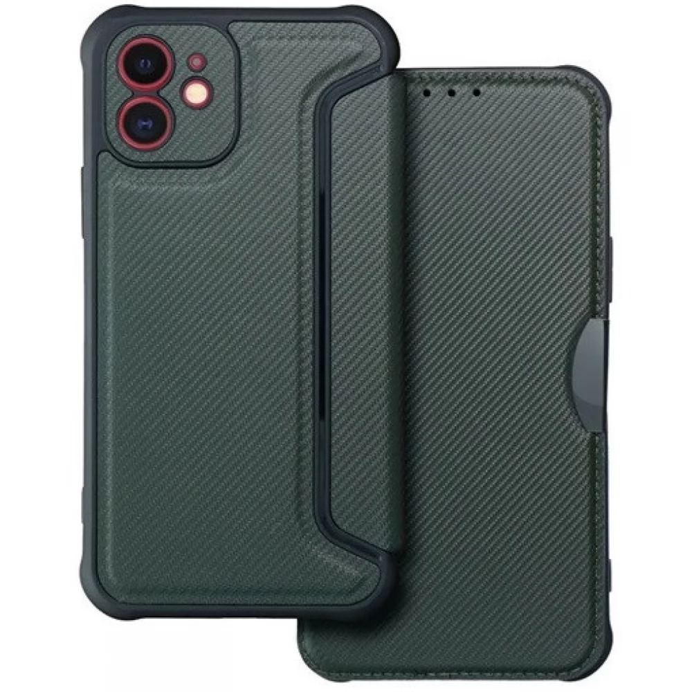 ZONE Razor Book oldalra nyitható tok bőrhatású karbon minta iPhone 11 zöld